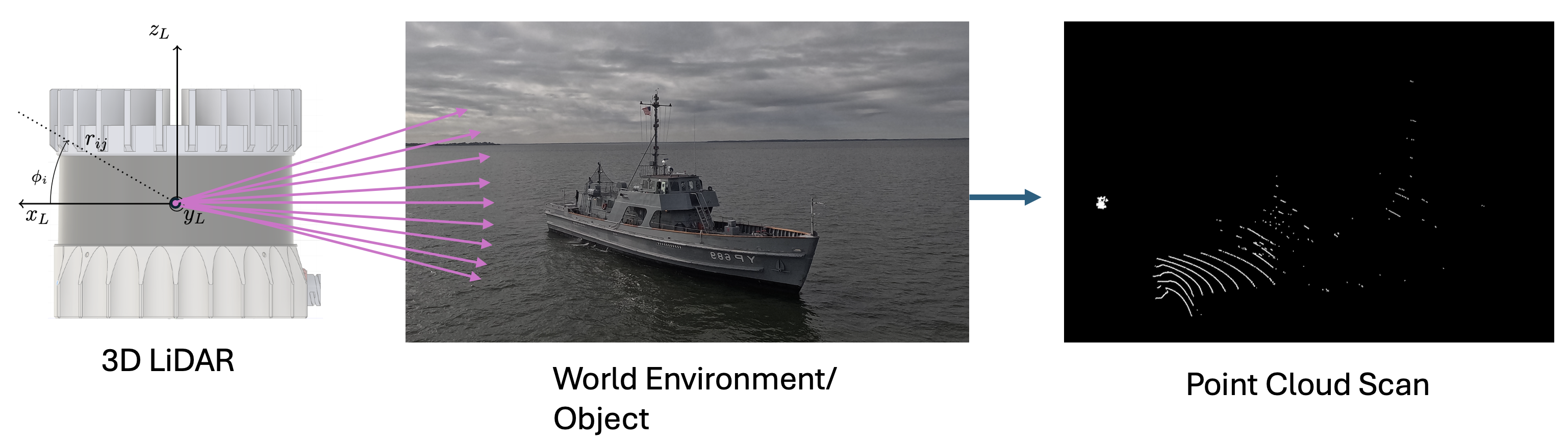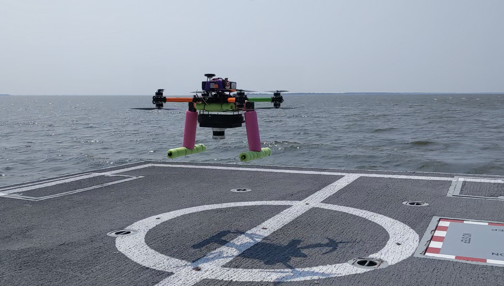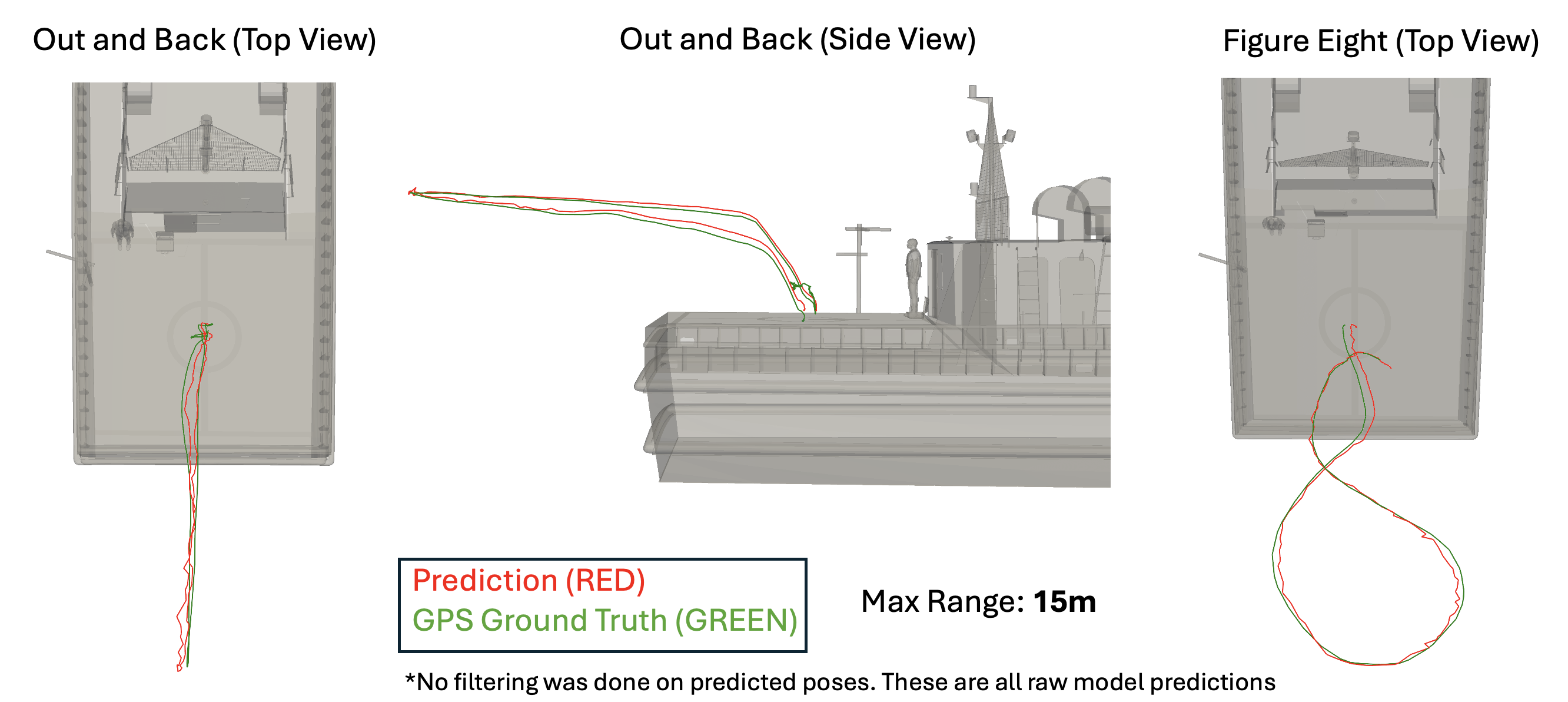 In addition to simulation data, we collected real-world validation data during experiments aboard the US Naval Academy’s YP689 research vessel in the Chesapeake Bay, MD. A UAV equipped with a real Ouster OS0-32 collected LiDAR data during full-length flight trajectories around the ship. High-accuracy ground-truth poses were also obtained using inertial integration3, as well as RTK GPS for benchmarking.