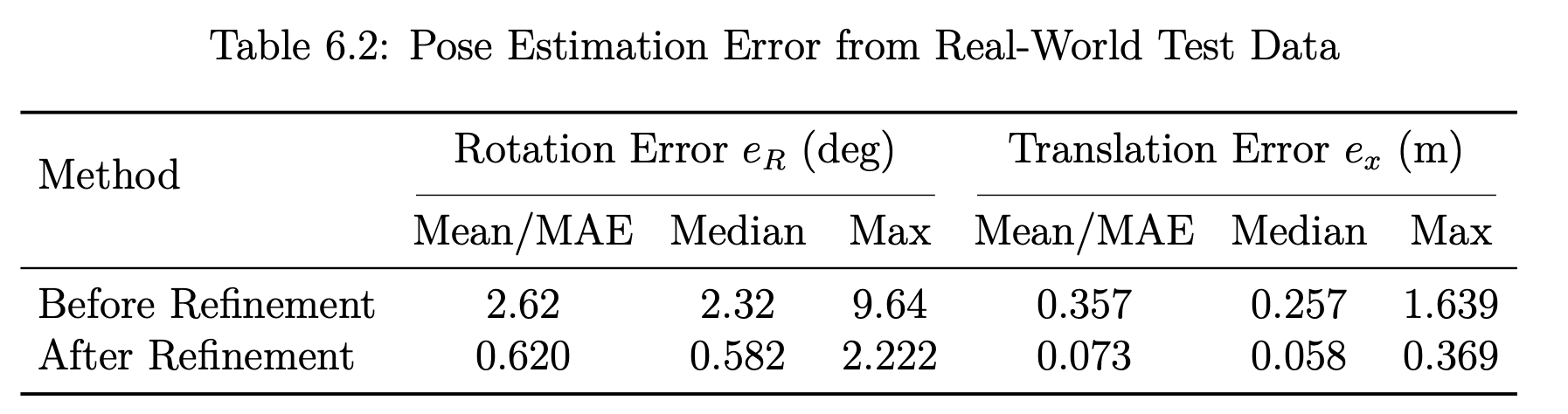 When evaluated on real-world LiDAR scans, the model achieved a mean rotation error of 2.6° and a mean translation error of 0.36 m directly from the network output. After applying a lightweight refinement step with GICP4, the accuracy improved substantially, reducing rotation errors to 0.62° and translation errors to 7 cm. Notably, more than 96% of predictions had less than 20 cm of translation error relative to the ground truth pose.